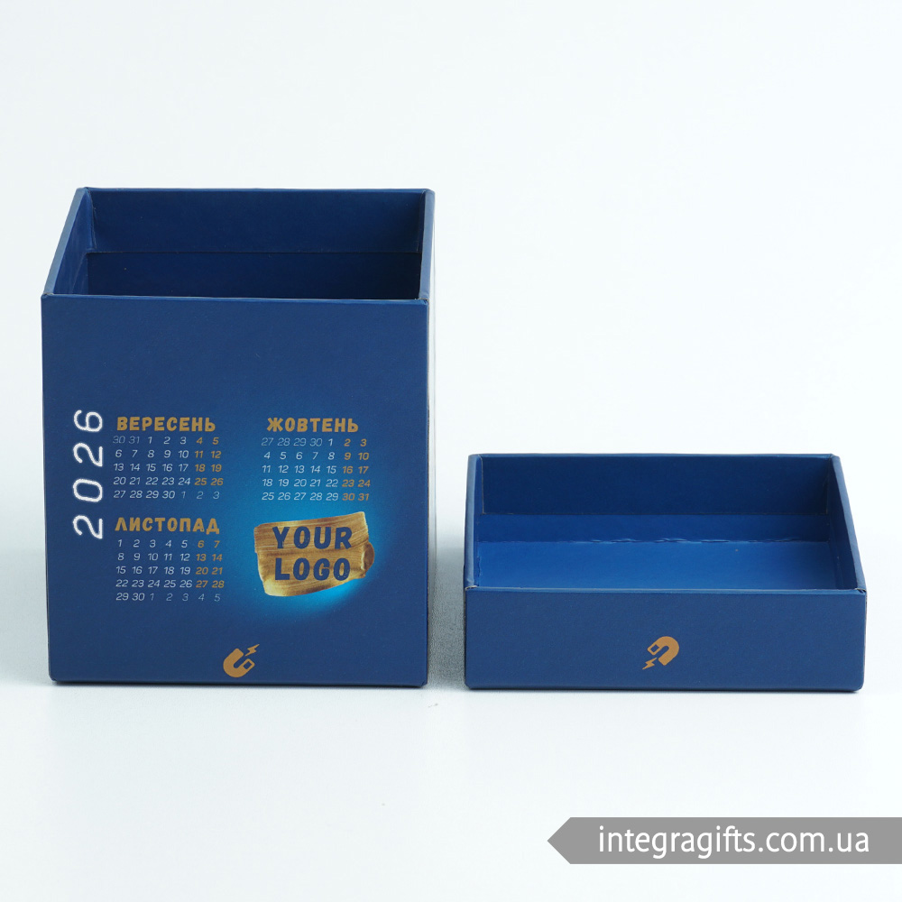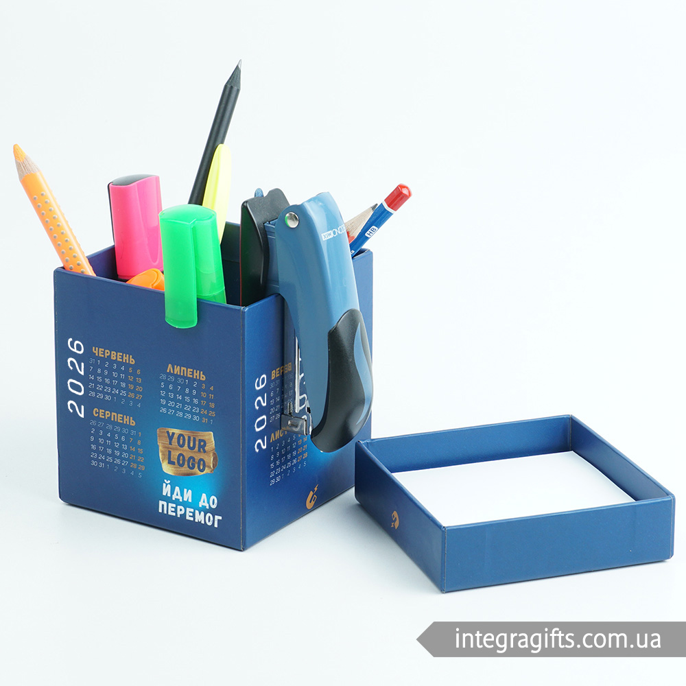 Стильний аксесуар три в одному: підставка під канцелярське приладдя, календар на весь рік, підставка під записні листи. Допоможе організувати порядок на робочому столі та додасть затишку офісному кабінету ваших співробітників, клієнтів або бізнес-партнерів.