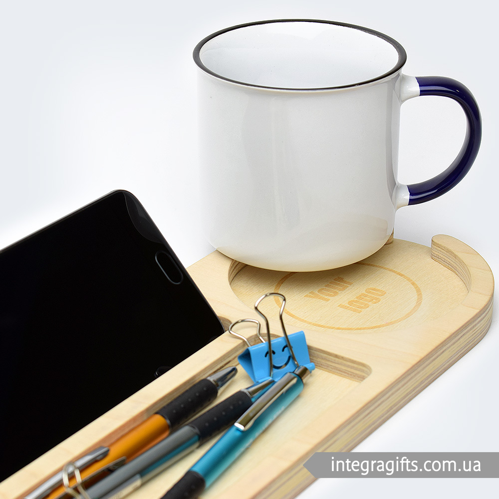 Компактний розмір і форма органайзера дозволяють розмістити його практично на будь-якому робочому столі, а це означає, що корпоративний подарунок буде працювати. В органайзері передбачено спеціальне місце для розміщення логотипу Вашої компанії, також можливе забарвлення або тонування виробу в потрібний колір.