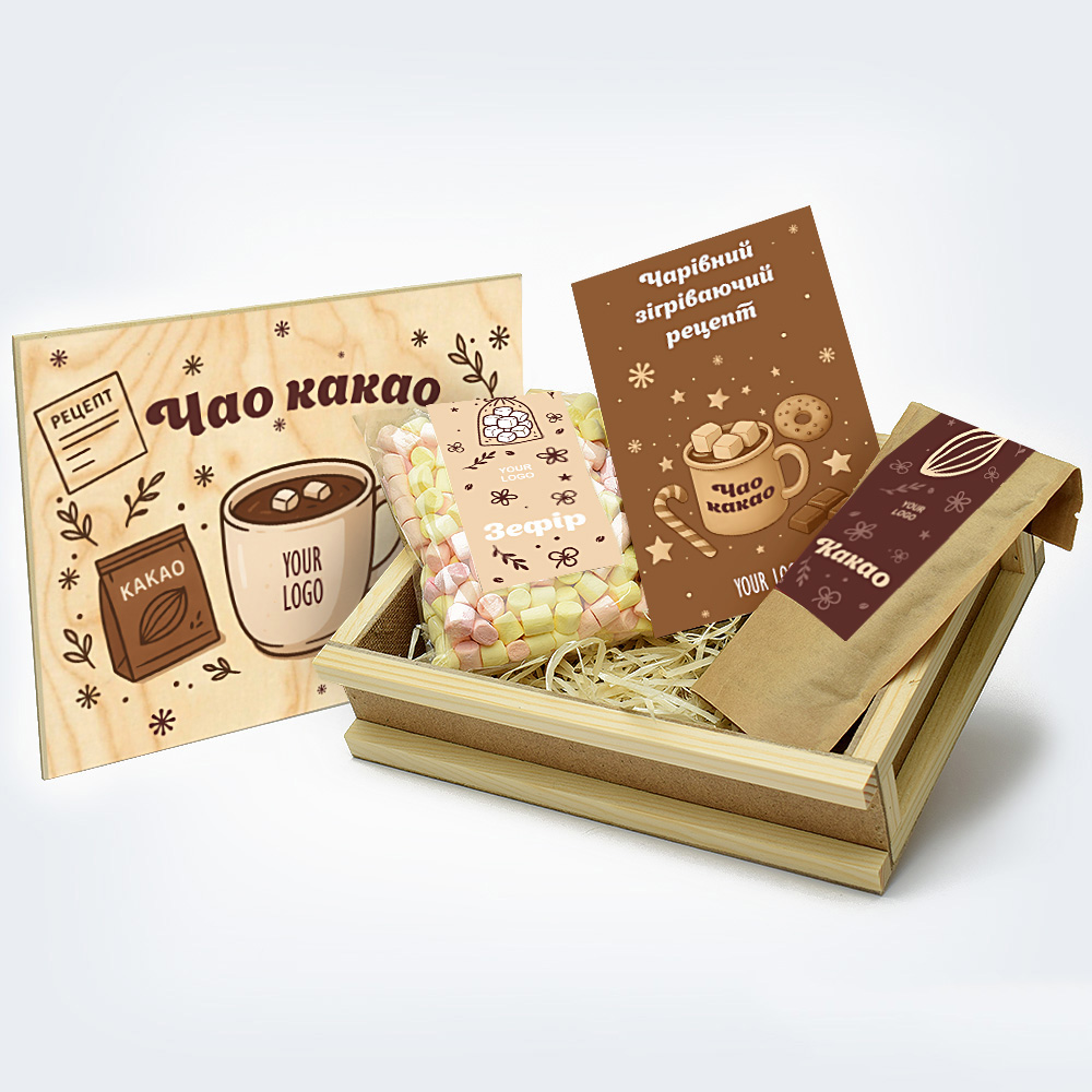 Подарунок «Чао какао mini» упакований у затишну коробку-посилку, а всередині лише якісні інгредієнти. Ми підібрали какао вищого ґатунку з високим вмістом какао-олії 20-22% та повітряні маршмеллоу, які при попаданні в гаряче какао перетворюються на повітряну піну. Какао упакований у крафтовий пакет із zip застібкою, що дозволяє його зручно зберігати та використовувати. Усі елементи корпоративного подарунка «Чао Какао mini» підлягають брендуванню. Ваш лого розміщується на упаковці, наклейках на какао та маршмеллоу, а також на листівці-рецепті.